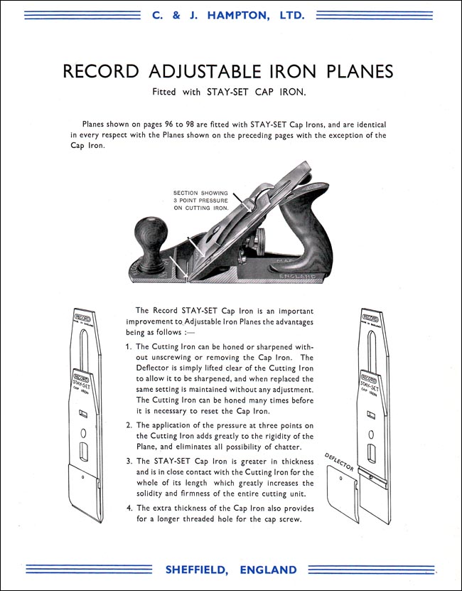 The following dates at which various patterns of planes were introduced have been obtained from the company catalogue, price lists, publicity leaflets and the various editions of the book Planecraft which C & J Hampton first published in 1934, second impression 1943, third impression 1945, fourth impression (revised and enlarged ) 1950, fifth impression 1953, sixth impression 1954, seventh impression (revised and enlarged) 1959. Planecraft was published to enhance the knowledge of the woodworker of the day about planes. Dates are accurate to within approximately one year. Record very often had new products in the shops before they appeared in their catalogues. In this respect publicity leaflets distributed to tool shops could inform prospective purchasers of a new tool which would be included in the next catalogue, when it was published.